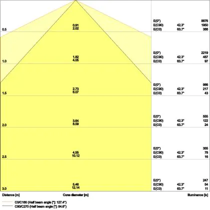 Beispiel: Wird eine Lampe mit einem Abstrahlwinkel von 60 Grad an der Decke (2,5 m Höhe) angebracht, erzeugt sie einen Lichtkegel von 2,9 Metern Durchmesser. Hat die Lampe hingegen einen Abstrahlwinkel von 120 Grad, beträgt der Lichtkegel 8,7 Meter im Durchmesser. |