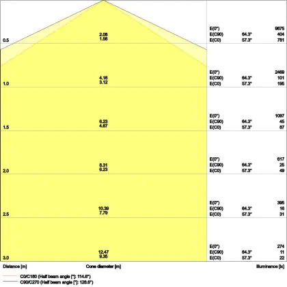 Beispiel: Wird eine Lampe mit einem Abstrahlwinkel von 60 Grad an der Decke (2,5 m Höhe) angebracht, erzeugt sie einen Lichtkegel von 2,9 Metern Durchmesser. Hat die Lampe hingegen einen Abstrahlwinkel von 120 Grad, beträgt der Lichtkegel 8,7 Meter im Durchmesser. |