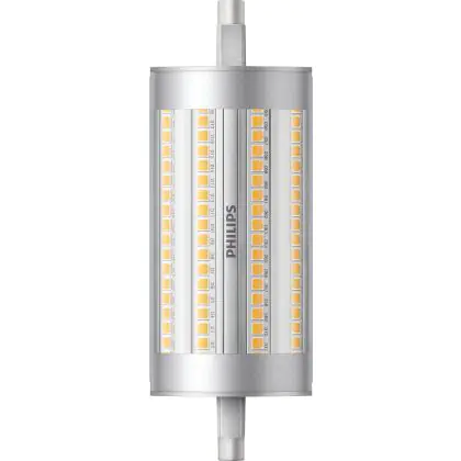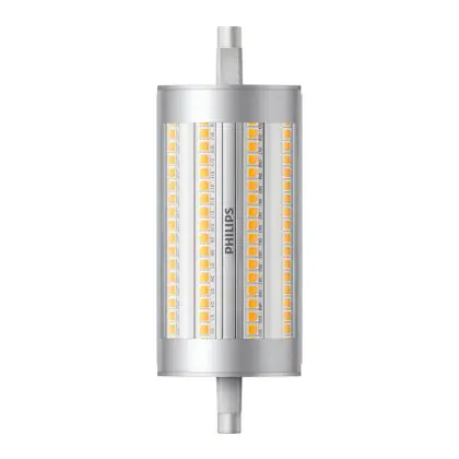 Die Philips CorePro LEDlinear R7s 17.5W 840 118mm | Dimmbar - Ersatz für 150W sind zweiseitig gesockelte Stablampen mit R7s-Sockel. Die LEDs sind der ideale LED-Ersatz für herkömmliche Halogenlampen und bieten dank ihrer besonderen Bauform rundum hochwertiges LED-Licht. Die CorePro-Lampe ist zudem dimmbar und arbeitet dank moderner LED-Chips besonders effizient.